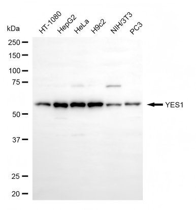 Western blotting analysis using YES1 antibody. Total cell lysates (30 μg) from various cell lines were loaded and separated by SDS-PAGE. The blot was incubated with YES1 antibody and HRP-conjugated goat anti-rabbit secondary antibody respectively.