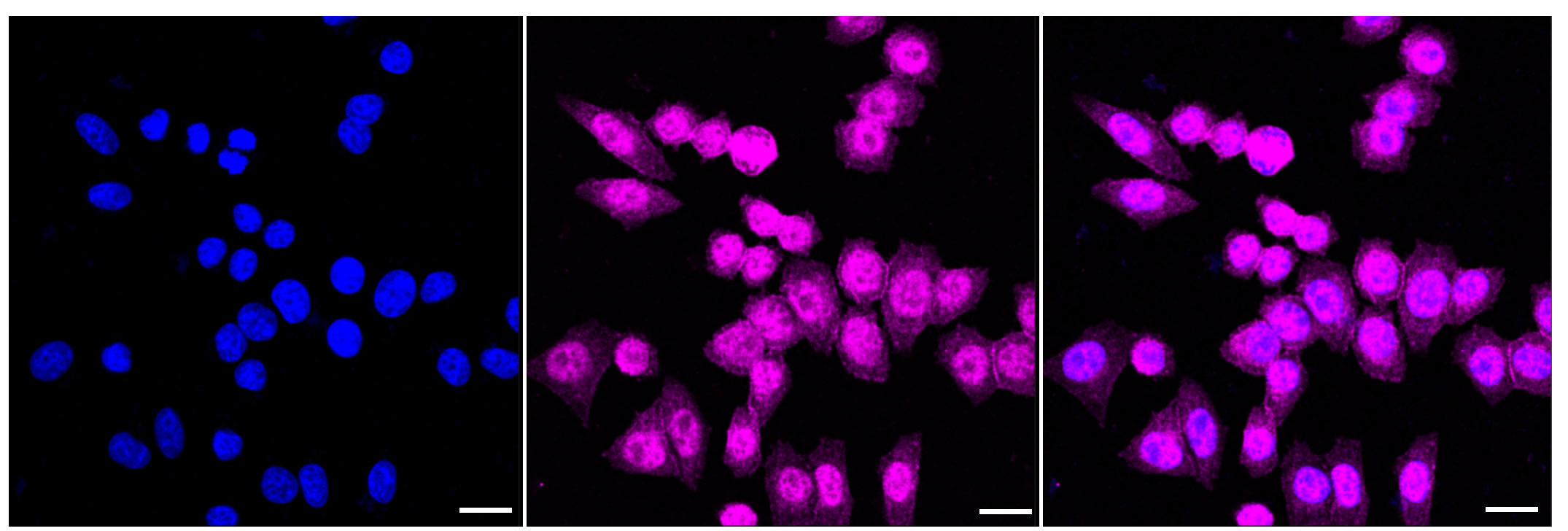 Immunocytochemical staining of HepG2 cells with 14-3-3 alpha/beta antibody. Nuclei were stained blue with DAPI; 14-3-3 alpha/beta was stained magenta with Alexa Fluor? 647. Images were taken using Leica stellaris 5. Protein abundance based on laser Intensity and smart gain: High. Scale bar: 20 μm.