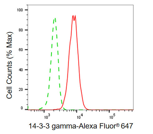 Flow cytometric analysis of 14-3-3 gamma expression in HepG2 cells using 14-3-3 gamma antibody. Green, isotype control; red, 14-3-3 gamma.