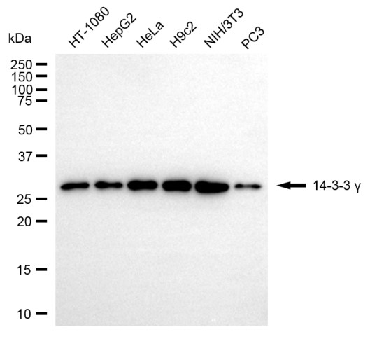 Western blotting analysis using 14-3-3 gamma antibody. Total cell lysates (30 μg) from various cell lines were loaded and separated by SDS-PAGE. The blot was incubated with 14-3-3 gamma antibody and HRP-conjugated goat anti-rabbit secondary antibody respectively.