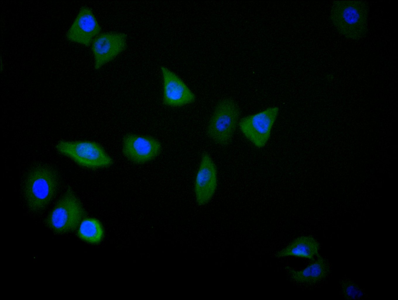 Immunofluorescence staining of Hela cell with CSB-RA026293MA1HU at 1:30 counter-stained with DAPI. The cells were fixed in 4% formaldehyde, permeabilized using 0.2% Triton X-100 and blocked in 10% normal Goat Serum. The cells were then incubated with the antibody overnight at 4°C. The secondary antibody was Alexa Fluor 488-congugated AffiniPure Goat Anti-Human IgG(H+L).