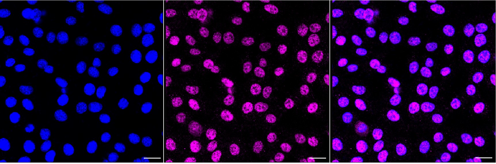 Immunocytochemical staining of C2C12 cells with Zinc fingers and homeoboxes 2 antibody. Nuclei were stained blue with DAPI; Zinc fingers and homeoboxes 2 was stained magenta with Alexa Fluor? 647. Images were taken using Leica stellaris 5. Protein abundance based on laser Intensity and smart gain: Medium. Scale bar, 20 μm.