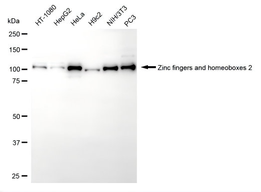 Western blotting analysis using zinc fingers and homeoboxes 2 antibody. Total cell lysates (30 μg) from various cell lines were loaded and separated by SDS-PAGE. The blot was incubated with zinc fingers and homeoboxes 2 antibody and HRP-conjugated goat anti-rabbit secondary antibody respectively.