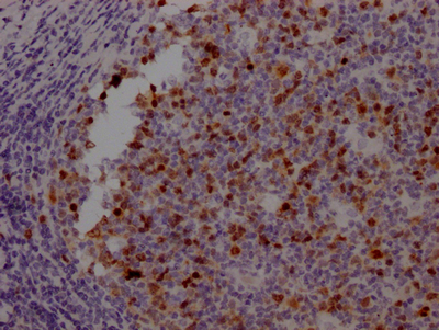 IHC image of CSB-RA230110A0HU diluted at 1:100 and staining in paraffin-embedded human tonsil tissue performed on a Leica BondTM system. After dewaxing and hydration, antigen retrieval was mediated by high pressure in a citrate buffer (pH 6.0). Section was blocked with 10% normal goat serum 30min at RT. Then primary antibody (1% BSA) was incubated at 4℃ overnight. The primary is detected by a Goat anti-rabbit IgG polymer labeled by HRP and visualized using 0.05% DAB.