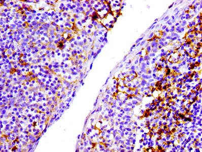 IHC image of CSB-RA017767A0HU diluted at 1:100 and staining in paraffin-embedded human tonsil tissue performed on a Leica BondTM system. After dewaxing and hydration, antigen retrieval was mediated by high pressure in a citrate buffer (pH 6.0). Section was blocked with 10% normal goat serum 30min at RT. Then primary antibody (1% BSA) was incubated at 4℃ overnight. The primary is detected by a biotinylated secondary antibody and visualized using an HRP conjugated SP system.