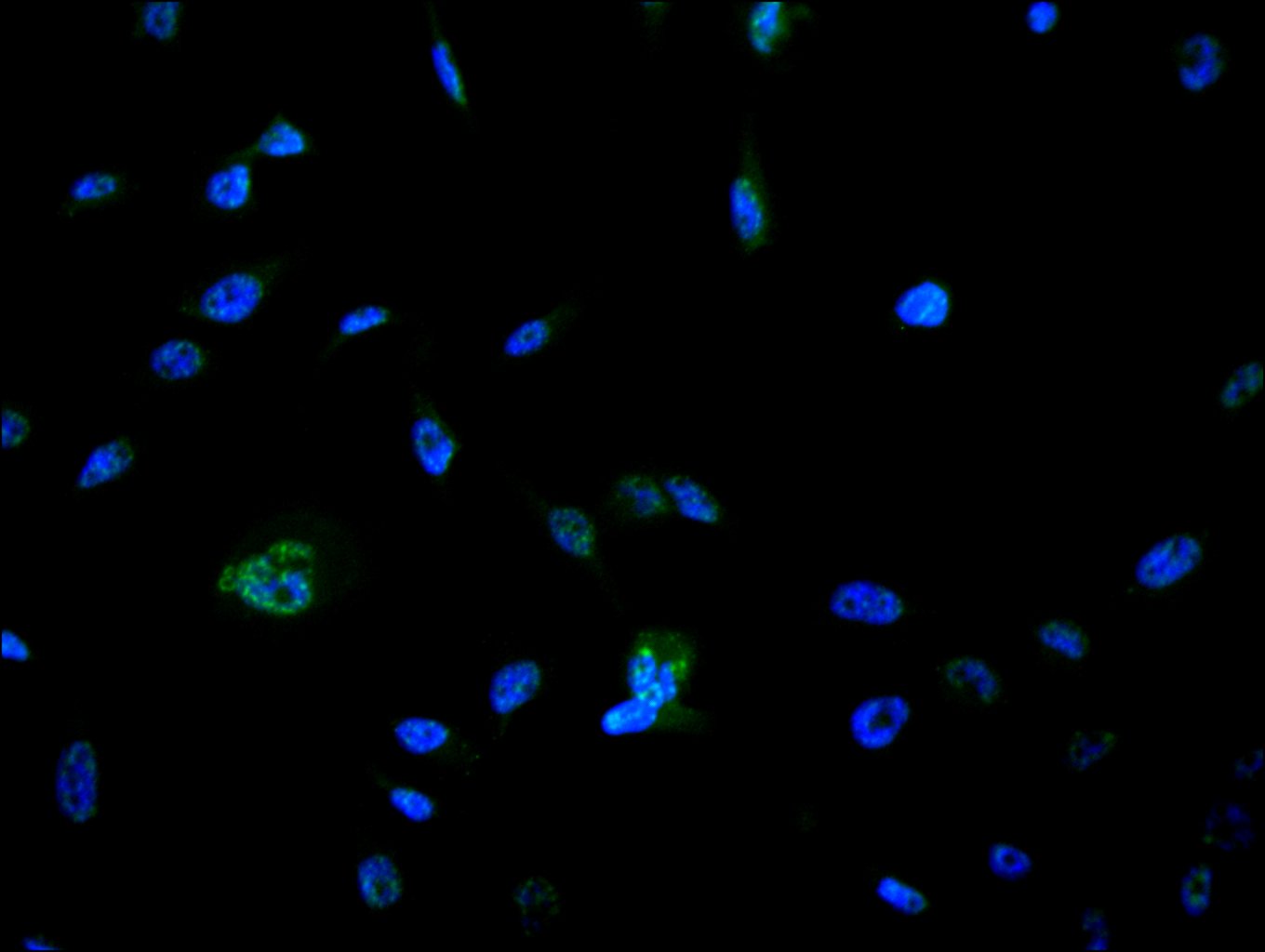 Immunofluorescence staining of U251 cell with CSB-RA004996A0HU at 1:50, counter-stained with DAPI. The cells were fixed in 4% formaldehyde and and permeated by 0.2% TritonX-100 for 15 min. Then 10% normal goat serum to block non-specific protein-protein interactions . The cells were then incubated with the antibody overnight at 4℃. The secondary antibody was Alexa Fluor 488-congugated AffiniPure Goat Anti-Rabbit IgG(H+L).