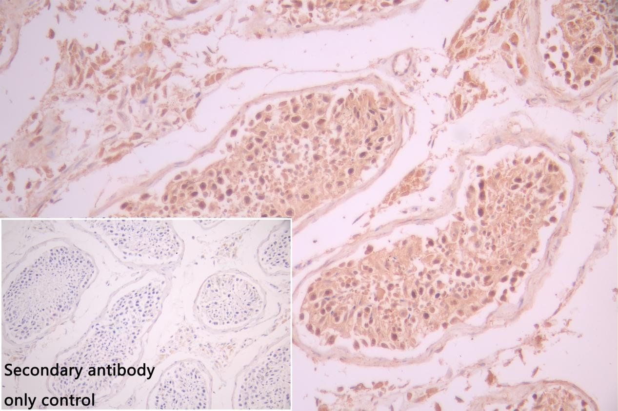 IHC image of CSB-RA004996A0HU diluted at 1:80 and staining in paraffin-embedded human testis tissue performed on a Leica BondTM system. After dewaxing and hydration, antigen retrieval was mediated by high pressure in a citrate buffer (pH 6.0). Section was blocked with 10% normal goat serum 30min at RT. Then primary antibody (1% BSA) was incubated at 4°C overnight. The primary is detected by a Goat anti-rabbit polymer IgG labeled by HRP and visualized using 0.05% DAB. Secondary antibody only control: uses 1% BSA instead of primary antibody