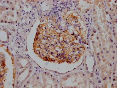 IHC image of CSB-RA714310A0HU diluted at 1:100 and staining in paraffin-embedded human kidney tissue performed on a Leica BondTM system. After dewaxing and hydration, antigen retrieval was mediated by high pressure in a citrate buffer (pH 6.0). Section was blocked with 10% normal goat serum 30min at RT. Then primary antibody (1% BSA) was incubated at 4℃ overnight. The primary is detected by a Goat anti-rabbit IgG polymer labeled by HRP and visualized using 0.05% DAB.