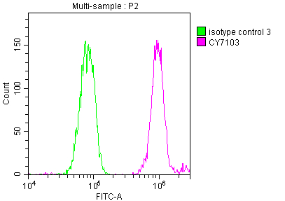 Overlay histogram showing Hela cells stained with CSB-RA231179A0HU (red line) at 1:50. The cells were fixed with 70% Ethylalcohol (18h) and then incubated in 10% normal goat serum to block non-specific protein-protein interactions followedby the antibody (1μg/1*106 cells) for 1 h at 4℃.The secondary antibody used was FITC-conjugated goat anti-rabbit IgG (H+L) at 1/200 dilution for 30min at 4℃. Control antibody (green line) was Rabbit IgG (1μg/1*106 cells) used under the same conditions. Acquisition of >10,000 events was performed.