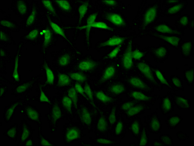 Immunofluorescence staining of Hela Cells with CSB-RA260392A0HU at 1:50, counter-stained with DAPI. The cells were fixed in 4% formaldehyde, permeated by 0.2% TritonX-100, and blocked in 10% normal Goat Serum. The cells were then incubated with the antibody overnight at 4℃. Nuclear DNA was labeled in blue with DAPI. The secondary antibody was FITC-conjugated AffiniPure Goat Anti-Rabbit IgG (H+L).