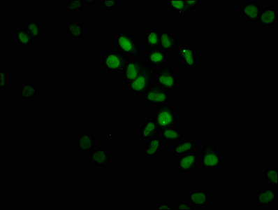 Immunofluorescence staining of Hela cells with CSB-RA880154A0HU at 1:23, counter-stained with DAPI. The cells were fixed in 4% formaldehyde, permeabilized using 0.2% Triton X-100 and blocked in 10% normal Goat Serum. The cells were then incubated with the antibody overnight at 4℃. The secondary antibody was Alexa Fluor 488-congugated AffiniPure Goat Anti-Rabbit IgG (H+L).