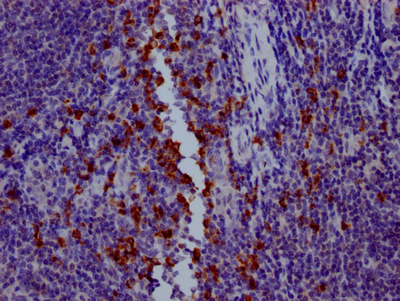 IHC image of CSB-RA794900A0HU diluted at 1:100 and staining in paraffin-embedded human tonsil tissue performed on a Leica BondTM system. After dewaxing and hydration, antigen retrieval was mediated by high pressure in a citrate buffer (pH 6.0). Section was blocked with 10% normal goat serum 30min at RT. Then primary antibody (1% BSA) was incubated at 4℃ overnight. The primary is detected by a Goat anti-rabbit IgG polymer labeled by HRP and visualized using 0.05% DAB.