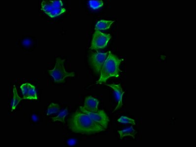 Immunofluorescence staining of MCF-7 cells with CSB-RA010833A0HU at 1:20, counter-stained with DAPI. The cells were fixed in 4% formaldehyde, permeabilized using 0.2% Triton X-100 and blocked in 10% normal Goat Serum. The cells were then incubated with the antibody overnight at 4℃. The secondary antibody was Alexa Fluor 488-congugated AffiniPure Goat Anti-Rabbit IgG (H+L).