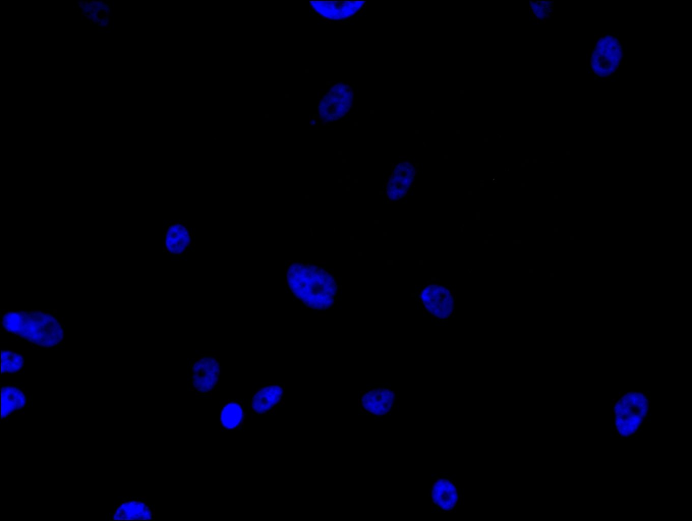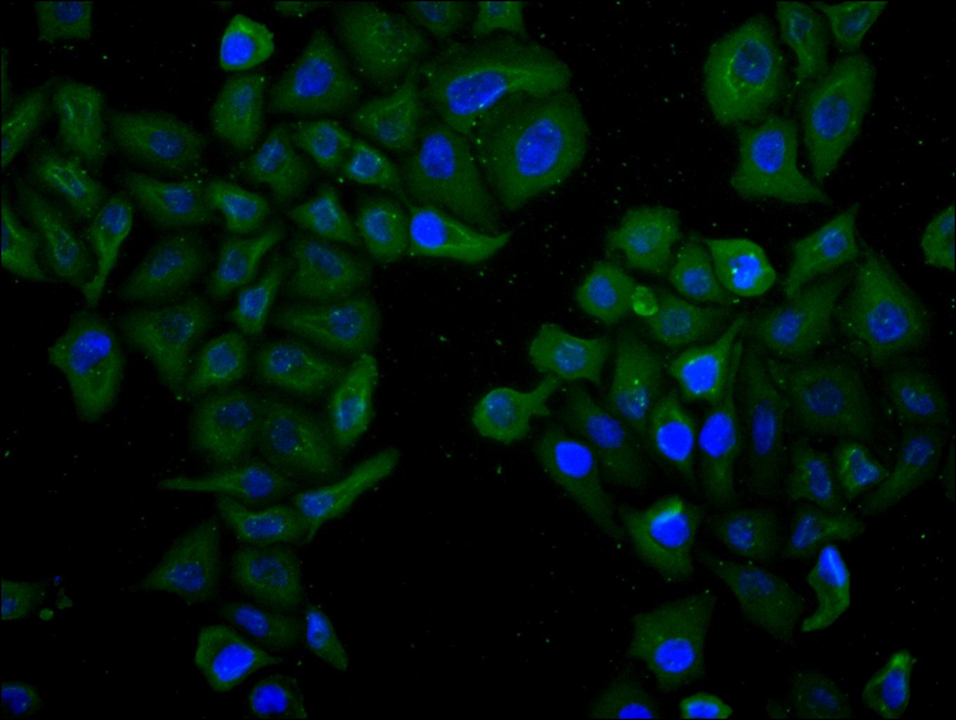 Immunofluorescence staining of PC-3 cell with 5% goat serum, counter-stained with DAPI. The cells were fixed in 4% formaldehyde and blocked in 10% normal Goat Serum. The cells were then incubated with the antibody overnight at 4C. The secondary antibody was Alexa Fluor 488-congugated AffiniPure Goat Anti-Rabbit IgG(H+L).
