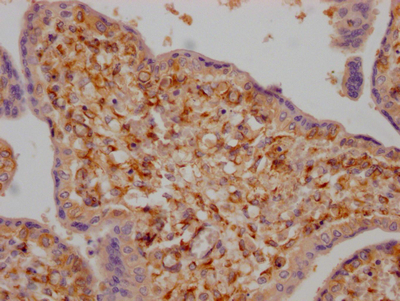 IHC image of CSB-RA907007A0HU diluted at 1:100 and staining in paraffin-embedded human placenta tissue performed on a Leica BondTM system. After dewaxing and hydration, antigen retrieval was mediated by high pressure in a citrate buffer (pH 6.0). Section was blocked with 10% normal goat serum 30min at RT. Then primary antibody (1% BSA) was incubated at 4℃ overnight. The primary is detected by a Goat anti-rabbit IgG polymer labeled by HRP and visualized using 0.05% DAB.
