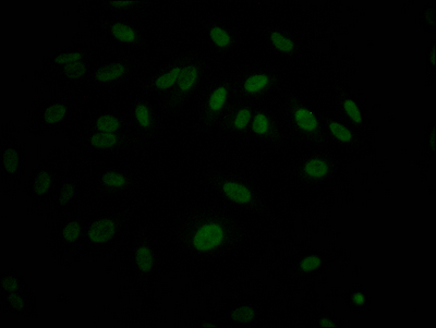 Immunofluorescence staining of Hela Cells with CSB-RA236860A0HU at 1:50, counter-stained with DAPI. The cells were fixed in 4% formaldehyde, permeated by 0.2% TritonX-100, and blocked in 10% normal Goat Serum. The cells were then incubated with the antibody overnight at 4℃. Nuclear DNA was labeled in blue with DAPI. The secondary antibody was FITC-conjugated AffiniPure Goat Anti-Rabbit IgG (H+L).