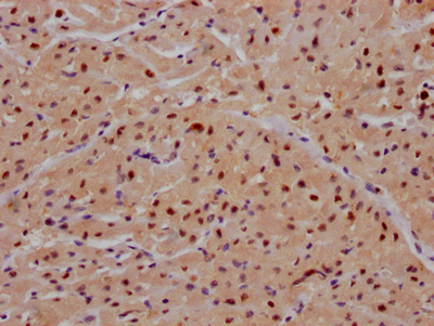 IHC image of CSB-RA236860A0HU diluted at 1:100 and staining in paraffin-embedded human heart tissue performed on a Leica BondTM system. After dewaxing and hydration, antigen retrieval was mediated by high pressure in a citrate buffer (pH 6.0). Section was blocked with 10% normal goat serum 30min at RT. Then primary antibody (1% BSA) was incubated at 4℃ overnight. The primary is detected by a Goat anti-rabbit IgG polymer labeled by HRP and visualized using 0.05% DAB.