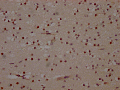 IHC image of CSB-RA236860A0HU diluted at 1:100 and staining in paraffin-embedded human brain tissue performed on a Leica BondTM system. After dewaxing and hydration, antigen retrieval was mediated by high pressure in a citrate buffer (pH 6.0). Section was blocked with 10% normal goat serum 30min at RT. Then primary antibody (1% BSA) was incubated at 4℃ overnight. The primary is detected by a Goat anti-rabbit IgG polymer labeled by HRP and visualized using 0.05% DAB.