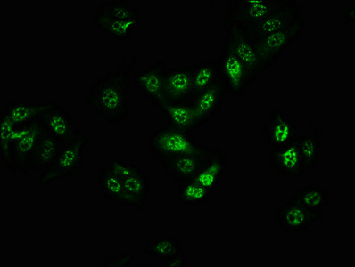 Immunofluorescence staining of HepG2 cells with CSB-RA002791A401phHU at 1:100,counter-stained with DAPI. The cells were fixed in 4% formaldehyde, permeabilized using 0.2% Triton X-100 and blocked in 10% normal Goat Serum. The cells were then incubated with the antibody overnight at 4℃. The secondary antibody was Alexa Fluor 488-congugated AffiniPure Goat Anti-Rabbit IgG (H+L).