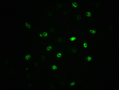 Immunofluorescence staining of A549 cells(treated with 100ng/ml EGF for 20min) with CSB-RA007523A51phHU at 1:100,counter-stained with DAPI. The cells were fixed in 4% formaldehyde, permeabilized using 0.2% Triton X-100 and blocked in 10% normal Goat Serum. The cells were then incubated with the antibody overnight at 4℃. The secondary antibody was Alexa Fluor 488-congugated AffiniPure Goat Anti-Rabbit IgG (H+L).