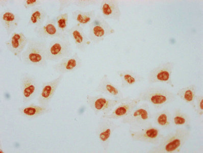 Immunocytochemistry analysis of CSB-RA010791A326phHU diluted at 1:80 and staining in Hela cells performed on a Leica BondTM system. The cells were fixed in 4% formaldehyde, permeabilized using 0.2% Triton X-100 and blocked with 10% normal goat serum 30min at RT. Then primary antibody (1% BSA) was incubated at 4℃ overnight. The primary is detected by a biotinylated secondary antibody and visualized using an HRP conjugated SP system.