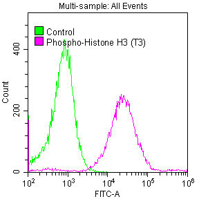 Overlay histogram showing Hela cells stained with CSB-RA010109A03phHU (red line) at 1:50. The cells were fixed with 70% Ethylalcohol (18h) and then permeabilized with 0.3% Triton X-100 for 2 min.The cells were then incubated in 1x PBS /10% normal goat serum to block non-specific protein-protein interactions followed by primary antibody for 1 h at 4℃.The secondary antibody used was FITC goat anti-rabbit IgG (H+L) at 1/200 dilution for 1 h at 4℃. Control antibody (green line) was used under the same conditions. Acquisition of >10,000 events was performed.