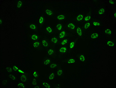 Immunofluorescence staining of Hela cells with CSB-RA013456A185phHU at 1:100,counter-stained with DAPI. The cells were fixed in 4% formaldehyde, permeabilized using 0.2% Triton X-100 and blocked in 10% normal Goat Serum. The cells were then incubated with the antibody overnight at 4℃. The secondary antibody was Alexa Fluor 488-congugated AffiniPure Goat Anti-Rabbit IgG (H+L).