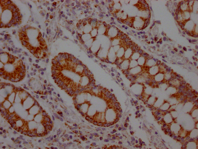 IHC image of CSB-RA919798A0HU diluted at 1:100 and staining in paraffin-embedded human colon cancer performed on a Leica BondTM system. After dewaxing and hydration, antigen retrieval was mediated by high pressure in a citrate buffer (pH 6.0). Section was blocked with 10% normal goat serum 30min at RT. Then primary antibody (1% BSA) was incubated at 4℃ overnight. The primary is detected by a Goat anti-rabbit IgG polymer labeled by HRP and visualized using 0.05% DAB.