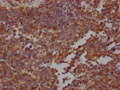 IHC image of CSB-RA188270A0HU diluted at 1:100 and staining in paraffin-embedded human lung cancer performed on a Leica BondTM system. After dewaxing and hydration, antigen retrieval was mediated by high pressure in a citrate buffer (pH 6.0). Section was blocked with 10% normal goat serum 30min at RT. Then primary antibody (1% BSA) was incubated at 4℃ overnight. The primary is detected by a Goat anti-rabbit IgG polymer labeled by HRP and visualized using 0.05% DAB.