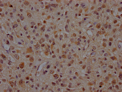 IHC image of CSB-RA182227A0HU diluted at 1:100 and staining in paraffin-embedded human glioma cancer performed on a Leica BondTM system. After dewaxing and hydration, antigen retrieval was mediated by high pressure in a citrate buffer (pH 6.0). Section was blocked with 10% normal goat serum 30min at RT. Then primary antibody (1% BSA) was incubated at 4℃ overnight. The primary is detected by a Goat anti-rabbit IgG polymer labeled by HRP and visualized using 0.05% DAB.