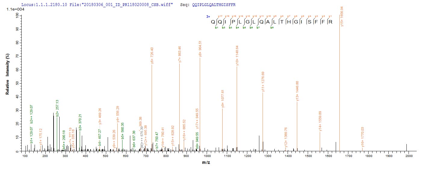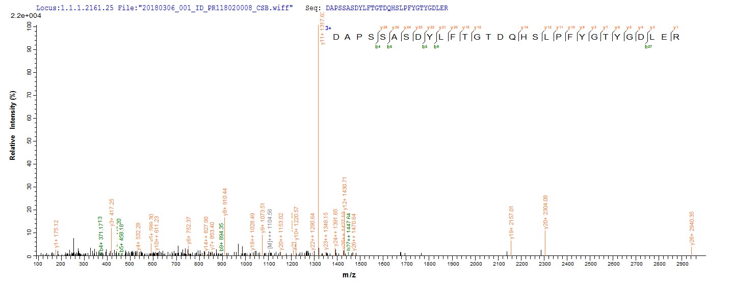 Based on the SEQUEST from database of Yeast host and target protein, the LC-MS/MS Analysis result of CSB-YP319970AAC could indicate that this peptide derived from Yeast-expressed Abrus precatorius (Indian licorice) (Glycine abrus) N/A.