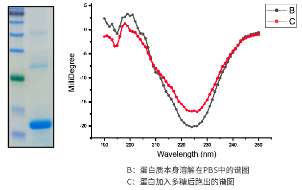 產(chǎn)品評價: 本蛋白會與小分子結(jié)合,結(jié)合后構(gòu)象發(fā)生改變,通過元二色譜分析其與不加小分子的對比。黑色的曲線為蛋白質(zhì)本身溶解在PBS中在圓二色譜中跑出的譜圖,紅色為蛋白加入多糖后跑出的譜圖。因蛋白會與多糖結(jié)合,所以構(gòu)象發(fā)生變化,225nm左右值會變大。