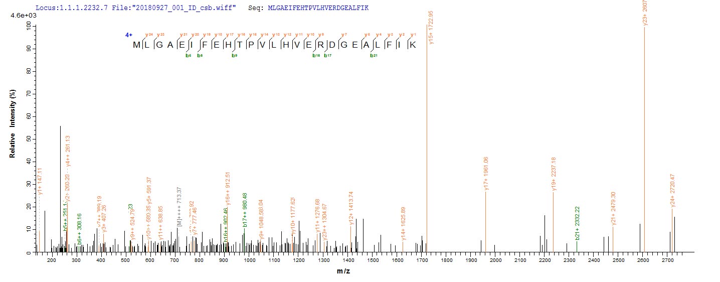 Based on the SEQUEST from database of E.coli host and target protein, the LC-MS/MS Analysis result of CSB-EP521738BRJ could indicate that this peptide derived from E.coli-expressed Bacillus subtilis (strain 168) thiO.