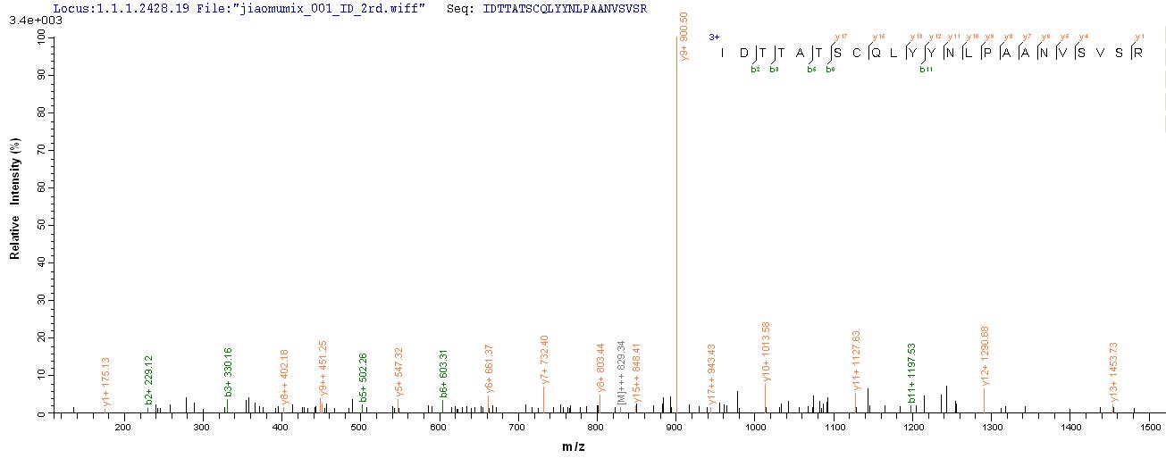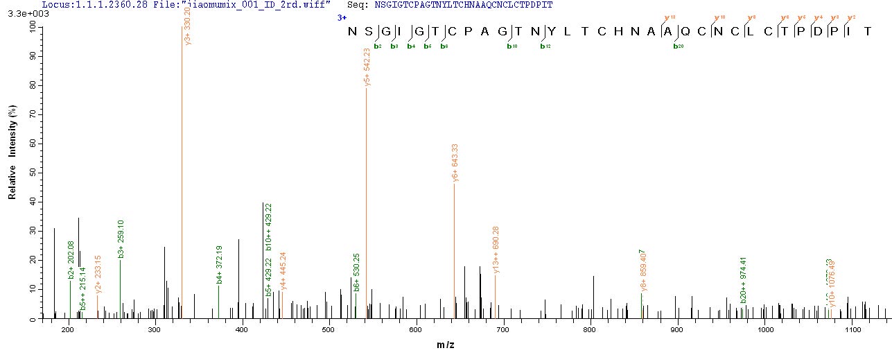 Based on the SEQUEST from database of E.coli host and target protein, the LC-MS/MS Analysis result of CSB-EP322803BJK could indicate that this peptide derived from E.coli-expressed Bovine coronavirus (strain Mebus) (BCoV) (BCV) S.