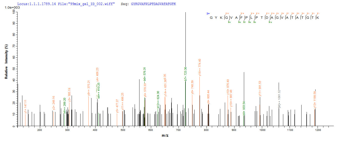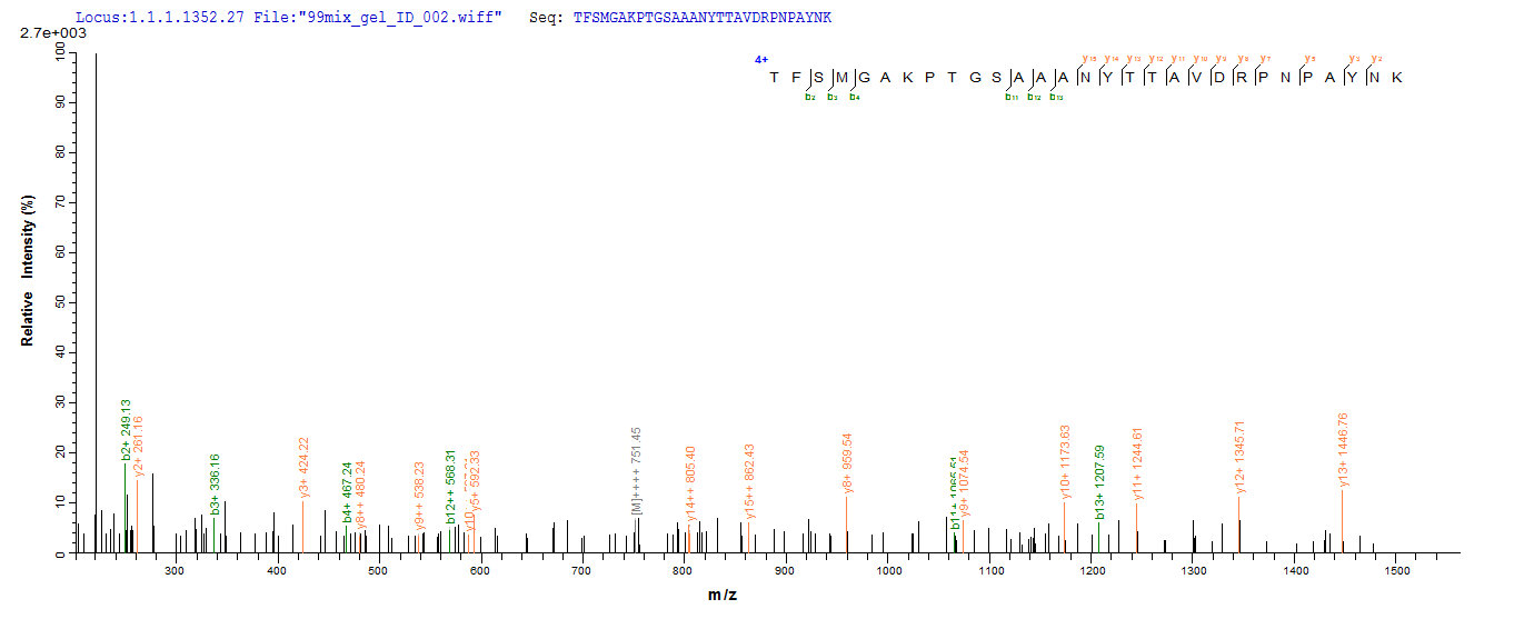 Based on the SEQUEST from database of E.coli host and target protein, the LC-MS/MS Analysis result of CSB-EP333258DRZ could indicate that this peptide derived from E.coli-expressed Chlamydia pneumoniae (Chlamydophila pneumoniae) ompA.