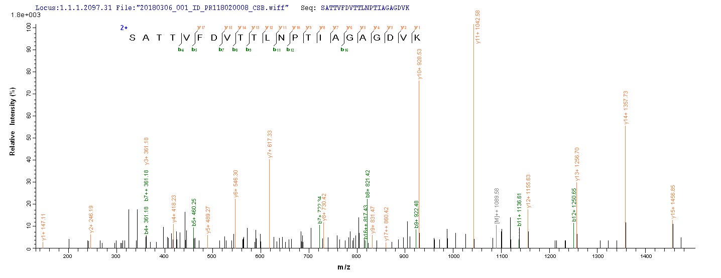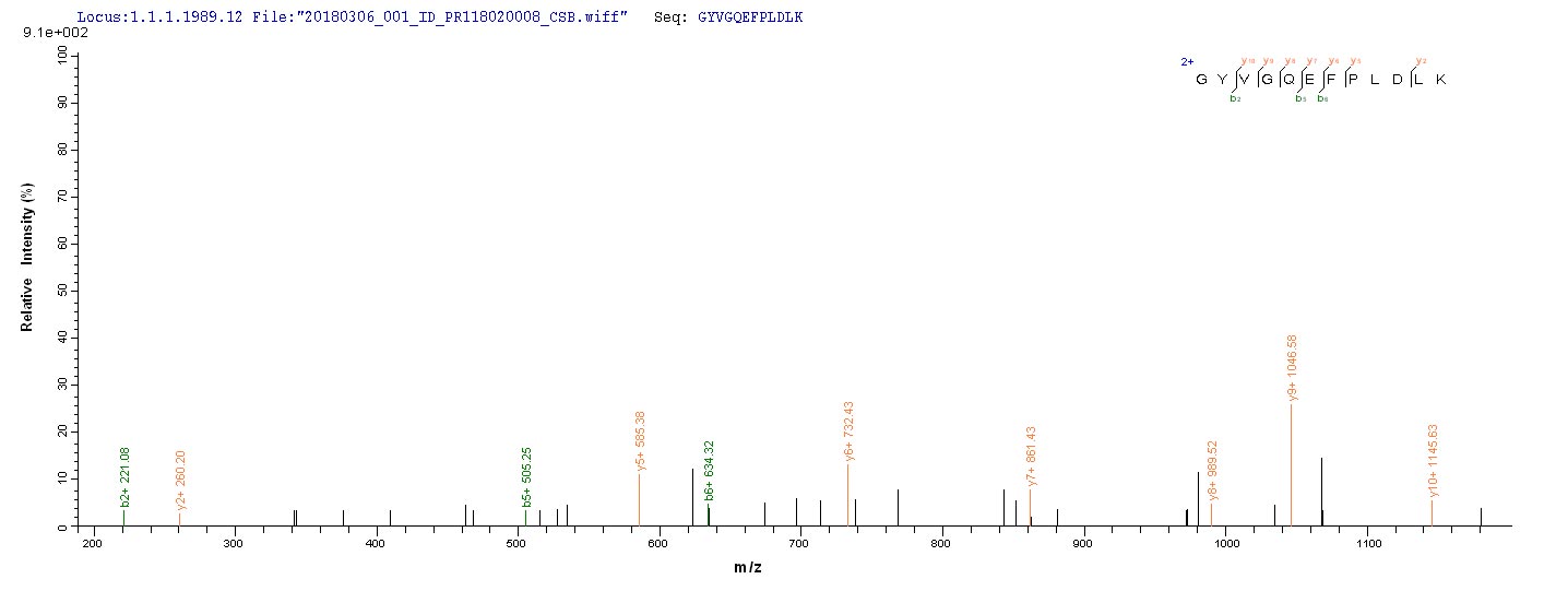 Based on the SEQUEST from database of E.coli host and target protein, the LC-MS/MS Analysis result of CSB-EP356881DSG could indicate that this peptide derived from E.coli-expressed Chlamydia trachomatis serovar L2 (strain 434/Bu / ATCC VR-902B) ompA.