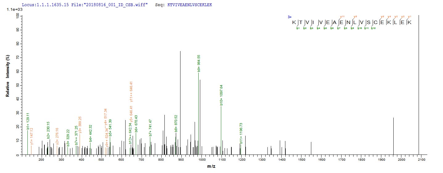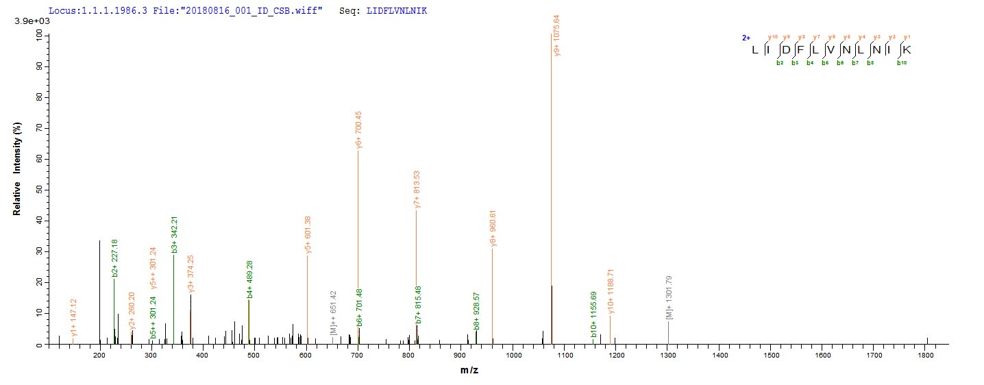Based on the SEQUEST from database of E.coli host and target protein, the LC-MS/MS Analysis result of CSB-EP327254DUB could indicate that this peptide derived from E.coli-expressed Clostridium acetobutylicum (strain ATCC 824 / DSM 792 / JCM 1419 / LMG 5710 / VKM B-1787) ctfA.