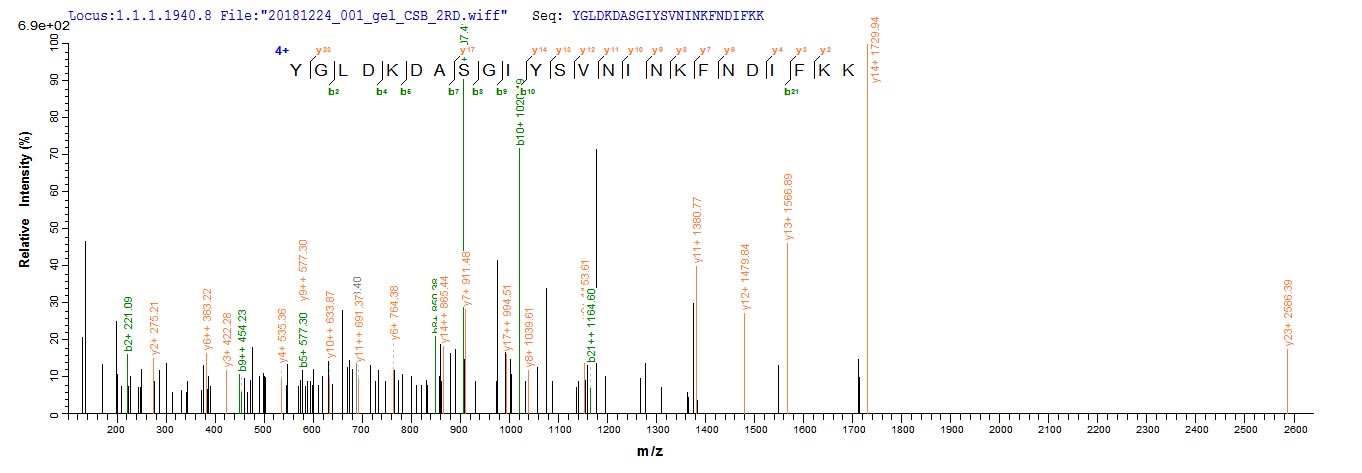 Based on the SEQUEST from database of Yeast host and target protein, the LC-MS/MS Analysis result of CSB-YP327013DUK could indicate that this peptide derived from Yeast-expressed Clostridium butyricum N/A.