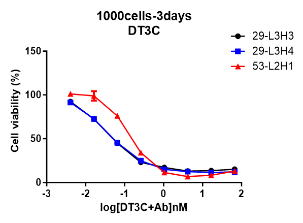 生物活性:①After DT3C 10μg/ml formed complexes with different concentrations of Anti-CCR8 antibodies (CSB-RA004847MA3HU), cytotoxicity experiments were conducted on CHOK1/Human CCR8 cells (CSB-SC004847HU2). The ED50 is 0.3708-0.5608 μg/ml.②After DT3C 10μg/ml formed complexes with different concentrations of Anti-CCR8 antibodies (CSB-RA004847MA3HU), cytotoxicity experiments were conducted on CT26/Human?CCR8?cells?(CSB-SC004847HU3). The ED50 is 0.4661-0.8614 μg/ml.