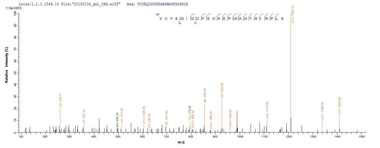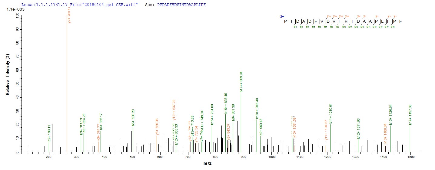 Based on the SEQUEST from database of Yeast host and target protein, the LC-MS/MS Analysis result of CSB-YP018263DO could indicate that this peptide derived from Yeast-expressed Canis lupus familiaris (Dog) (Canis familiaris) PNLIPRP1.