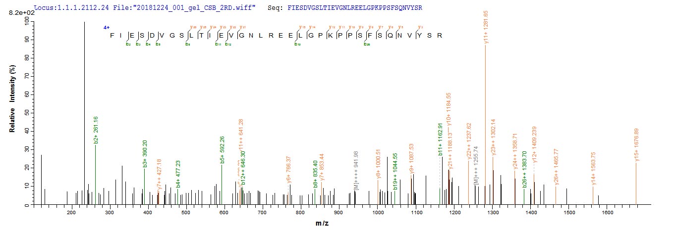 Based on the SEQUEST from database of E.coli host and target protein, the LC-MS/MS Analysis result of CSB-EP319157EDZ could indicate that this peptide derived from E.coli-expressed Enterobacteria phage T4 (Bacteriophage T4) wac.