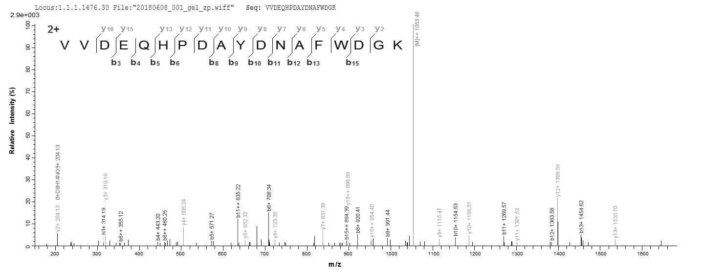 Based on the SEQUEST from database of E.coli host and target protein, the LC-MS/MS Analysis result of CSB-EP769310ELW could indicate that this peptide derived from E.coli-expressed Enterococcus faecalis (strain ATCC 700802 / V583) gelE.