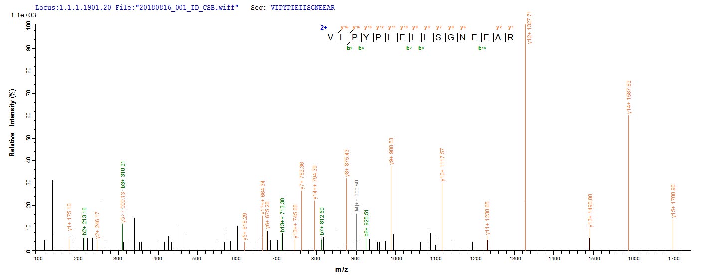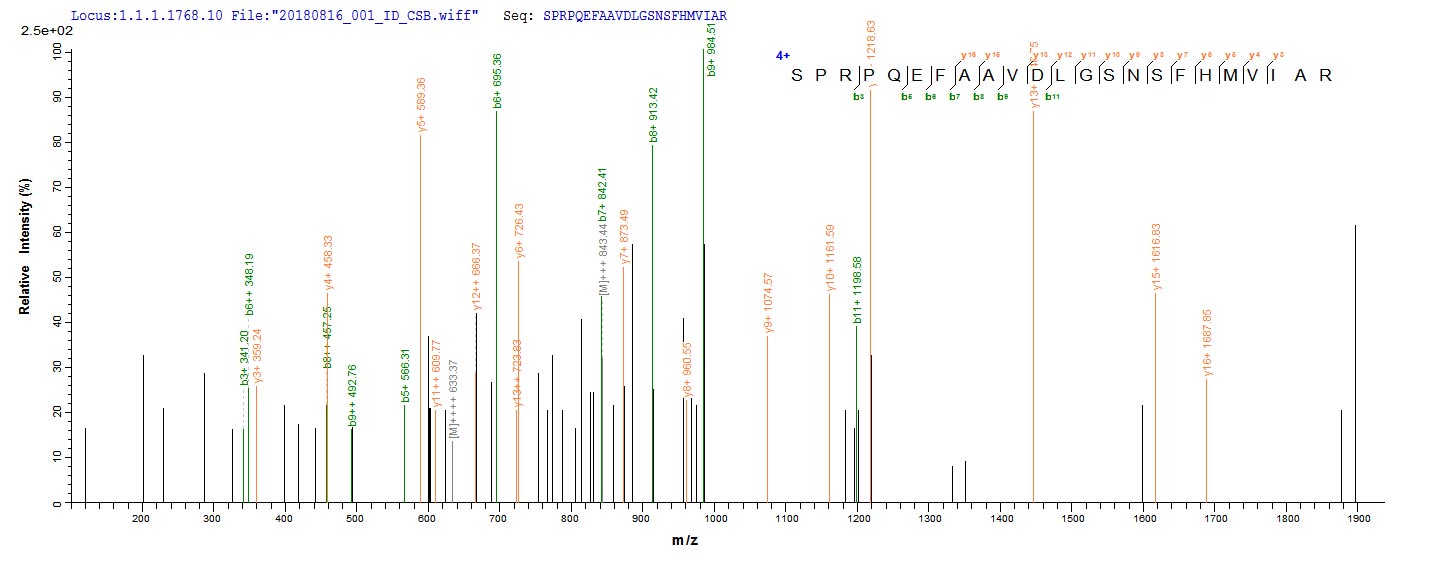 Based on the SEQUEST from database of E.coli host and target protein, the LC-MS/MS Analysis result of CSB-EP365319ENV could indicate that this peptide derived from E.coli-expressed Escherichia coli (strain K12) ppx.