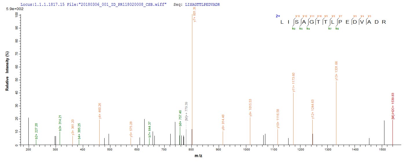 Based on the SEQUEST from database of E.coli host and target protein, the LC-MS/MS Analysis result of CSB-EP364094ENV could indicate that this peptide derived from E.coli-expressed Escherichia coli (strain K12) ruvB.