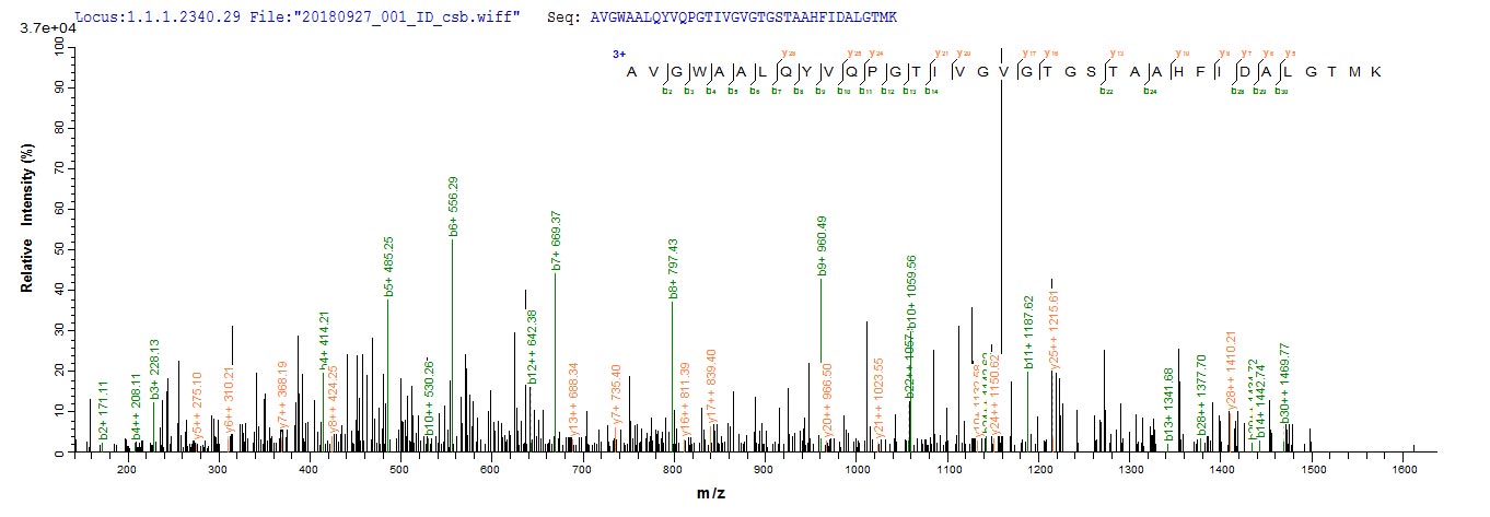 Based on the SEQUEST from database of Yeast host and target protein, the LC-MS/MS Analysis result of CSB-YP540419ENT could indicate that this peptide derived from Yeast-expressed Escherichia coli (strain K12) rpiA.