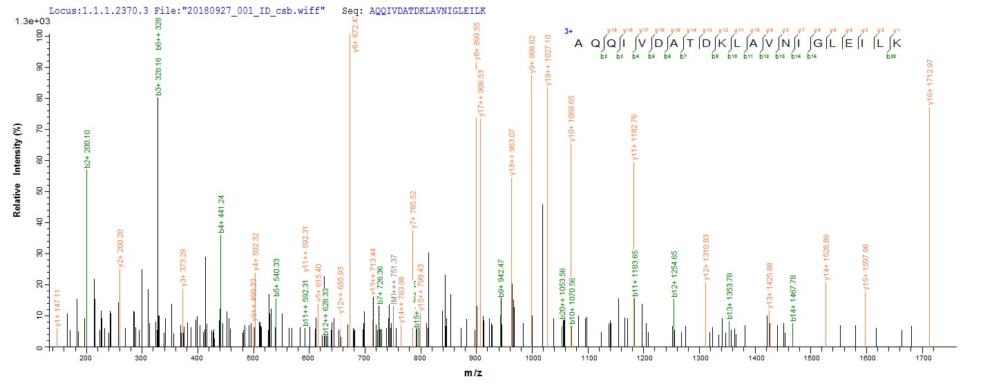 Based on the SEQUEST from database of E.coli host and target protein, the LC-MS/MS Analysis result of CSB-EP359086ENV could indicate that this peptide derived from E.coli-expressed Escherichia coli (strain K12) talB.