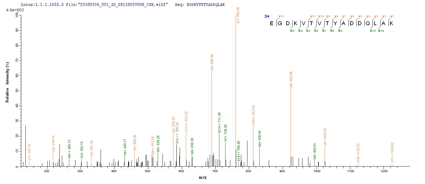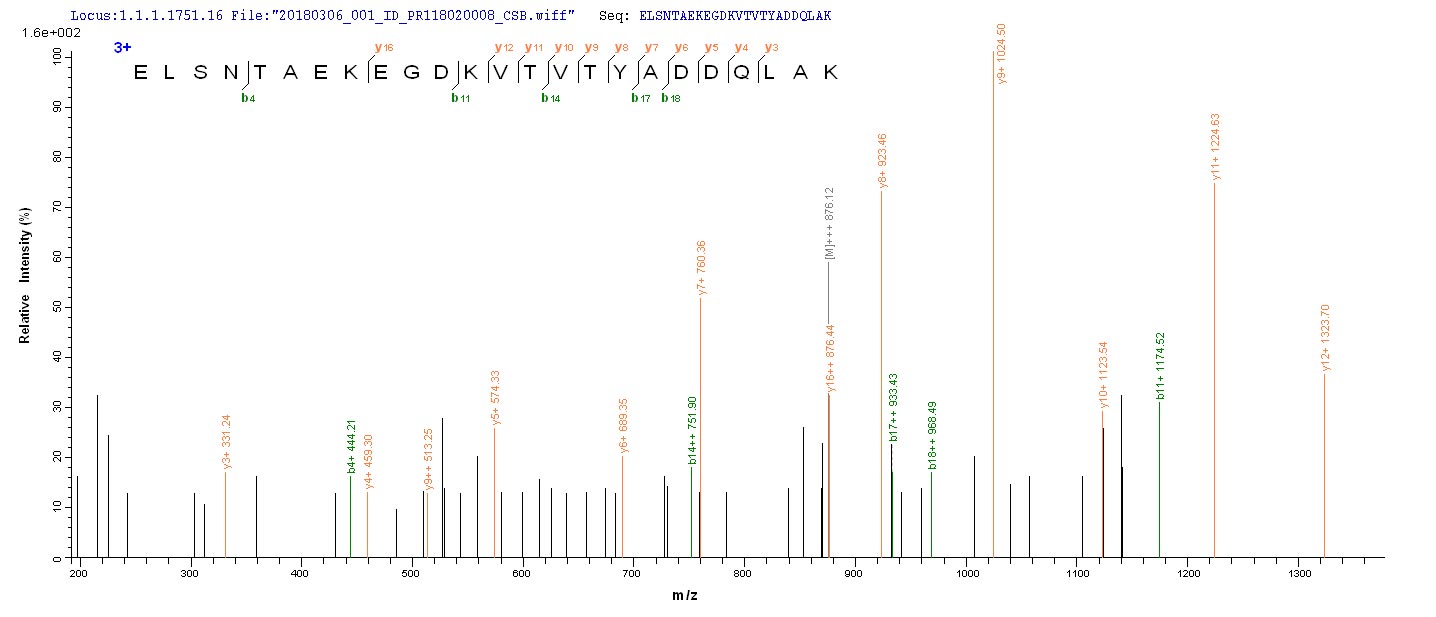 Based on the SEQUEST from database of E.coli host and target protein, the LC-MS/MS Analysis result of CSB-EP337381HUV could indicate that this peptide derived from E.coli-expressed Helicobacter pylori (strain ATCC 700392 / 26695) (Campylobacter pylori) dps.