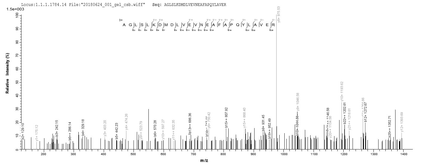 Based on the SEQUEST from database of E.coli host and target protein, the LC-MS/MS Analysis result of CSB-EP001118HU could indicate that this peptide derived from E.coli-expressed Homo sapiens (Human) ACAA2.