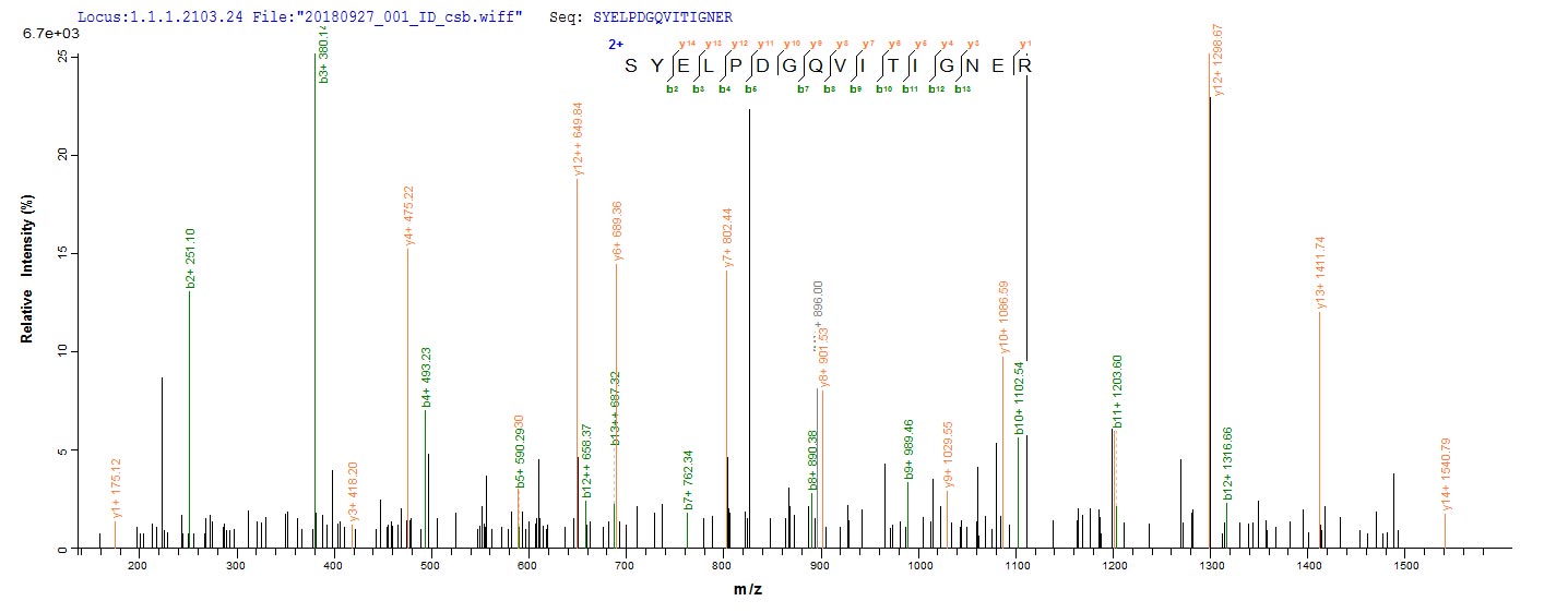 Based on the SEQUEST from database of E.coli host and target protein, the LC-MS/MS Analysis result of CSB-EP001207HU could indicate that this peptide derived from E.coli-expressed Homo sapiens (Human) ACTB.