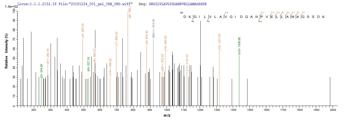 Based on the SEQUEST from database of Yeast host and target protein, the LC-MS/MS Analysis result of CSB-YP409861HU could indicate that this peptide derived from Yeast-expressed Homo sapiens (Human) COL6A6.